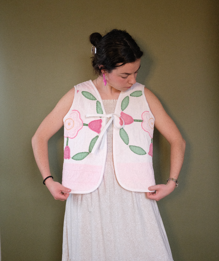 Each of these will come with a quilt/quilt pattern as they are all one of a kind. The pattern created for this vest uses reclaimed quilts - featuring a tie closure in the center front. You will not receive any of the items photographed, they are examples of the item you are purchasing. They are final sale.