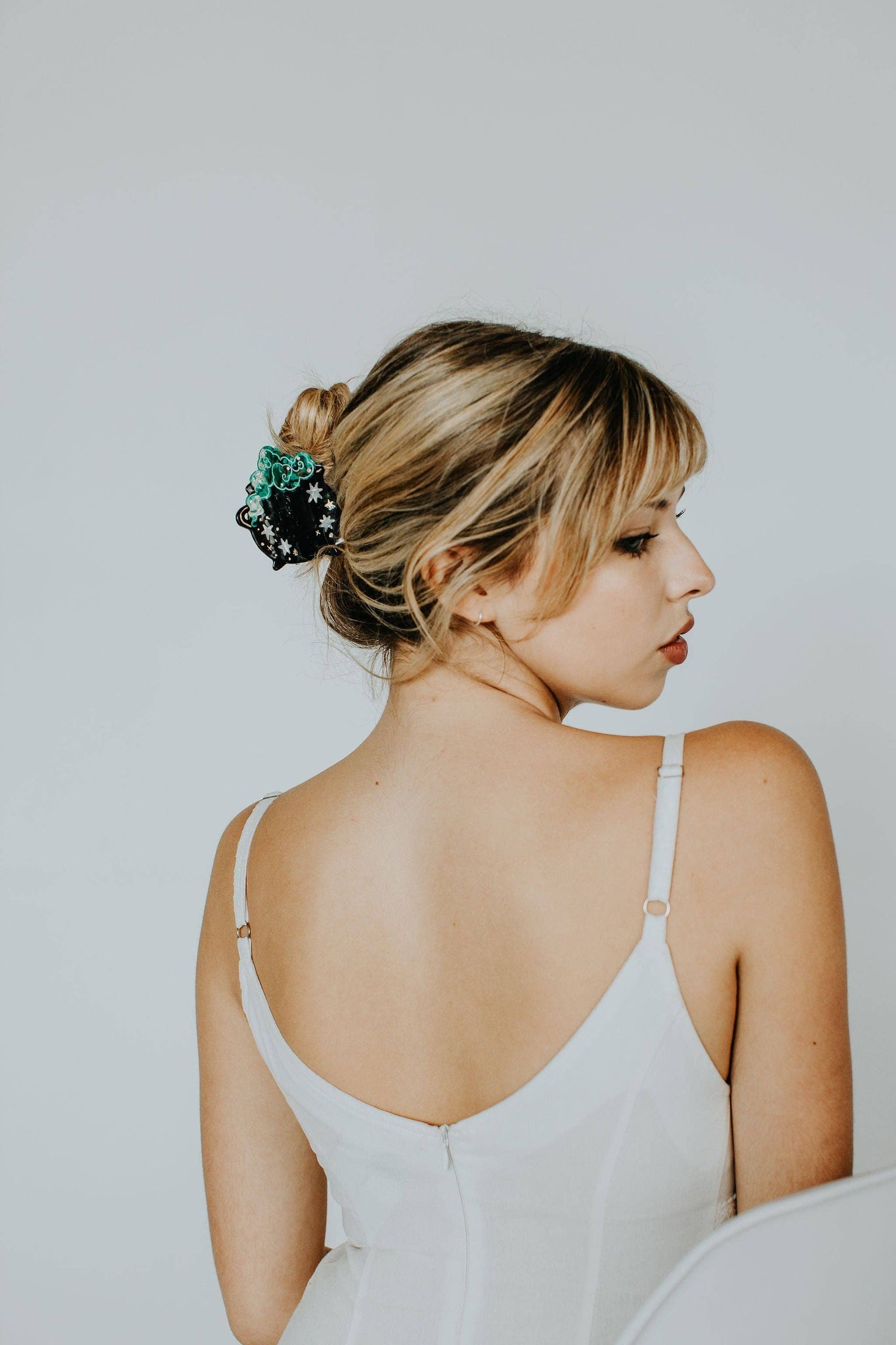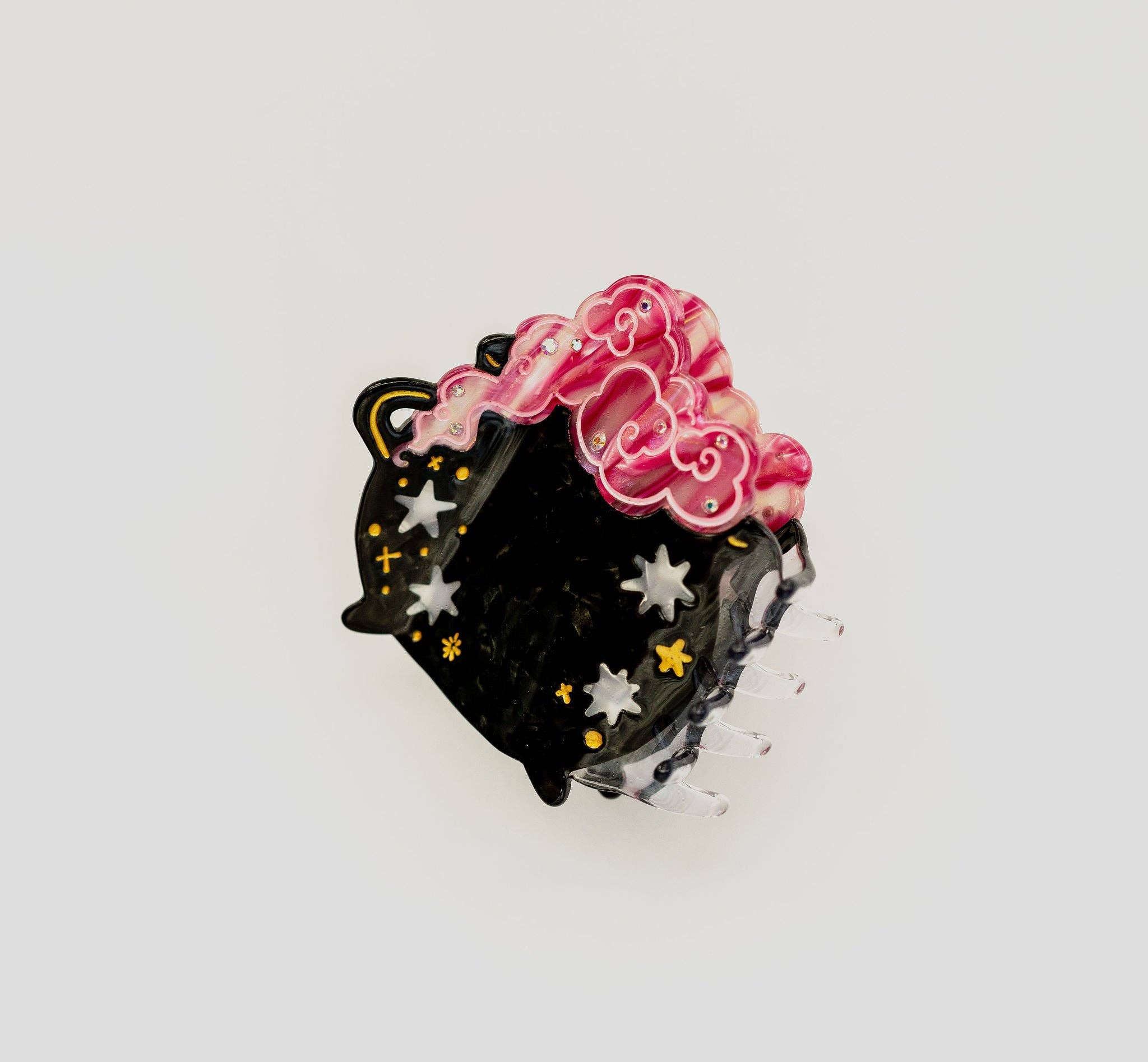 Bewitch your lazy hair days with the best-selling Cauldron Claw, now back and better than ever. In black and pink for spooky season, the updated claw has redesigned teeth made with thicker hair in mind to give you a better, more comfortable hold. Featuring a variated black acetate base with semi-transparent hot pink smoke and star and gem accents.