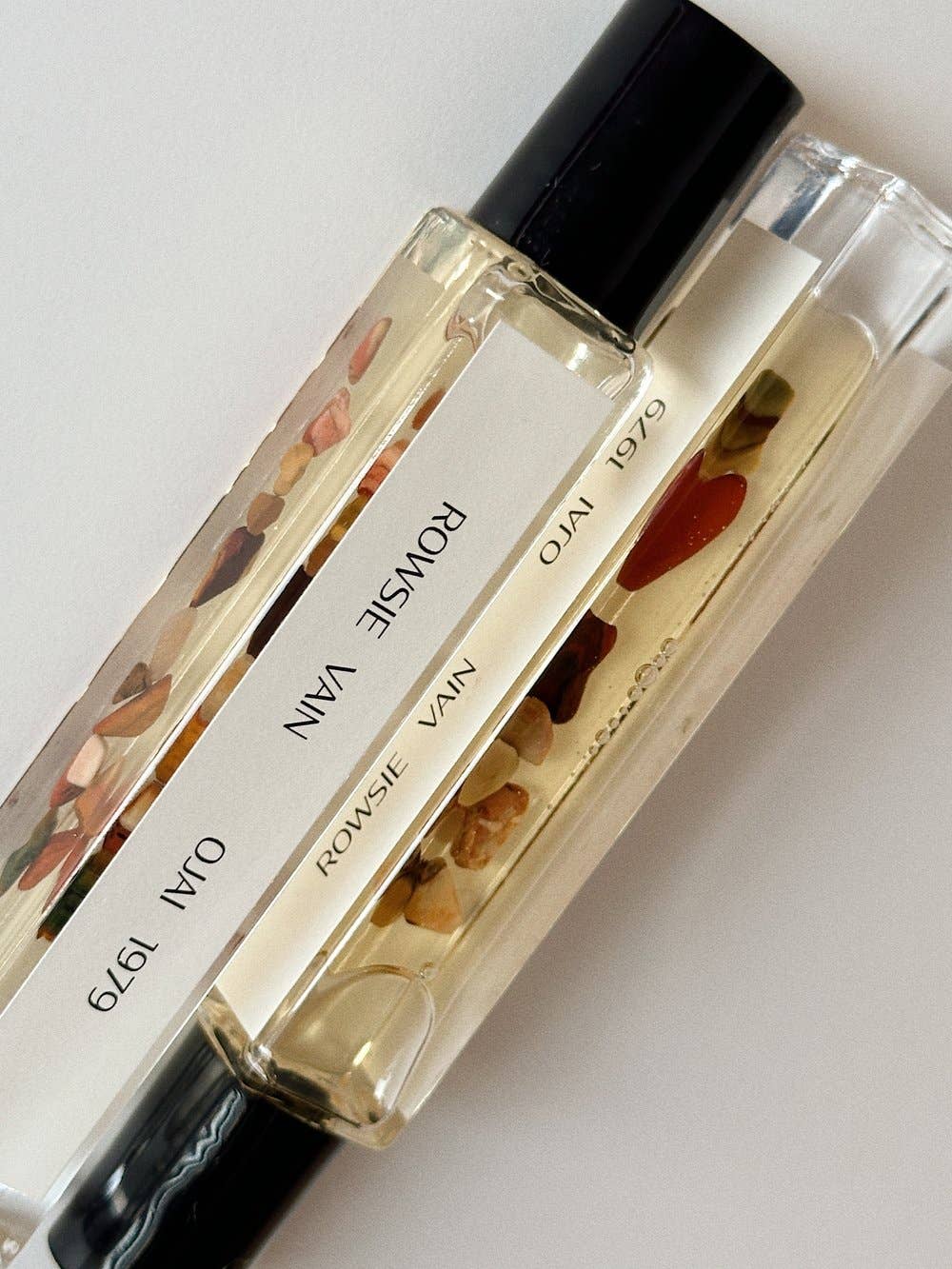 OJAI 1979 is a grounding, soothing, and awakening blend of organic MCT coconut oil, frankincense essential oil, vetiver essential oil, solar-infused & ethically sourced palo santo oil, and mookaite jasper gemstones.