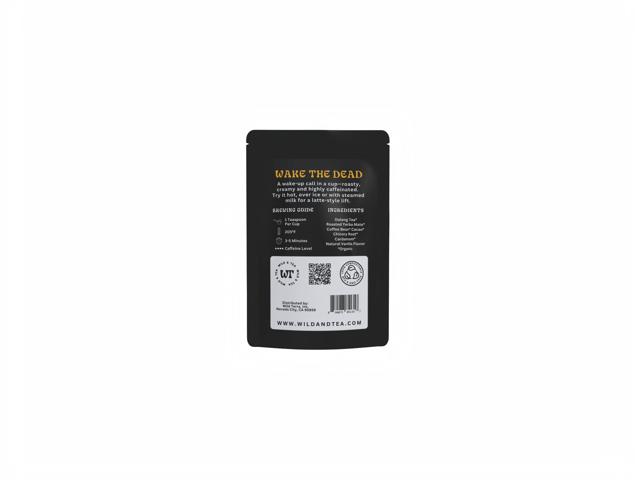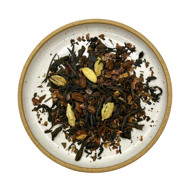 A wake-up call in a cup—roasty, creamy and highly caffeinated. Try it hot, over ice or with steamed milk for a latte-style lift. Ingredients- Oolong tea°, roasted yerba mate°, coffee bean°, cacao°, chicory root°, cardamom° and natural vanilla flavor °Organic Caffeine Level- High Brew- 1 teaspoon per cup | Water Temp- 205°F | Steep Time-3-5 minutes. Loose leaf Approximately 10 cups of tea per oz 100% Compostable, BPA & GMO-Free Packaging.