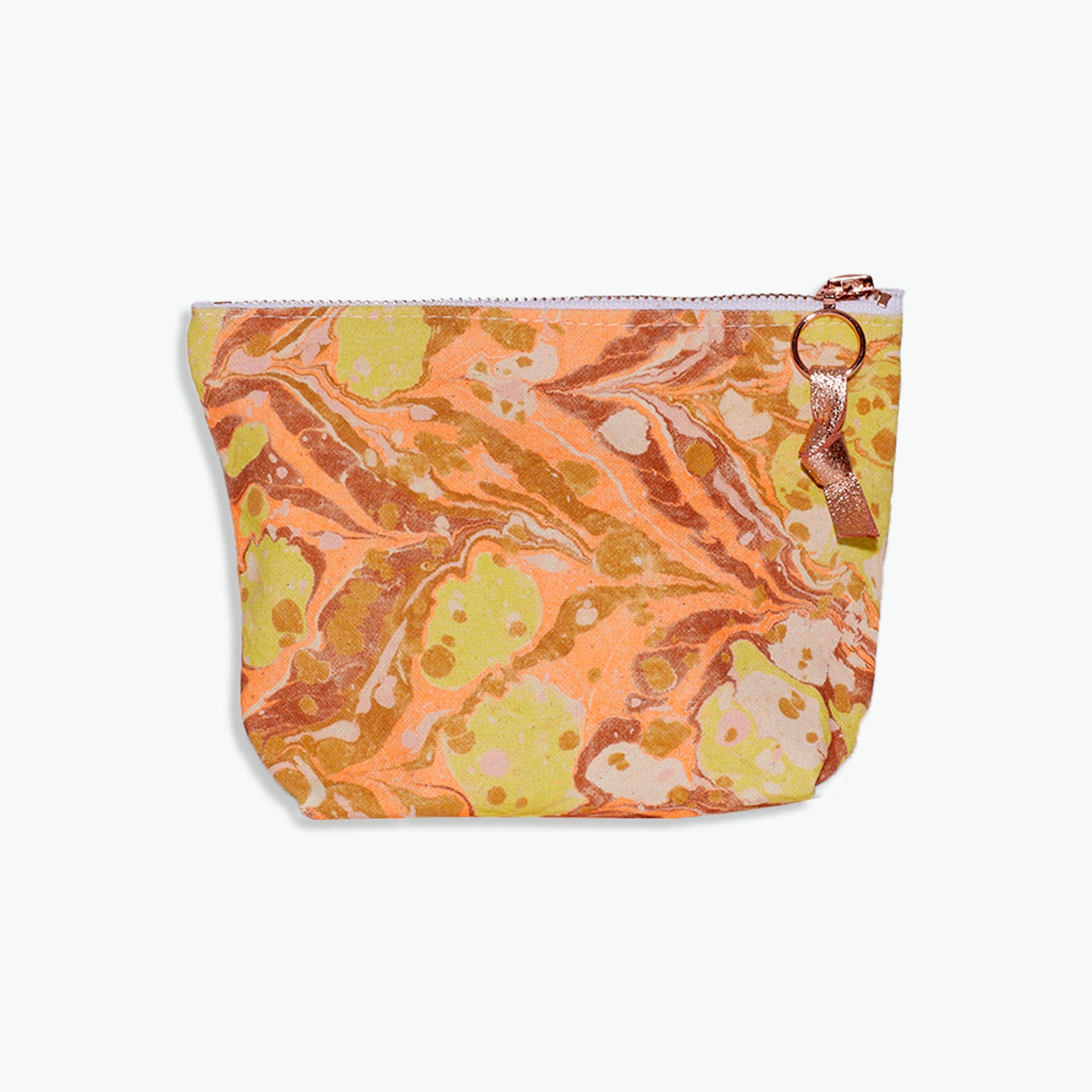 Hand marbled panels of cotton canvas sewn into these marvelous canvas pouches perfect for all sorts of objects and accessories, or to use as a cute clutch.